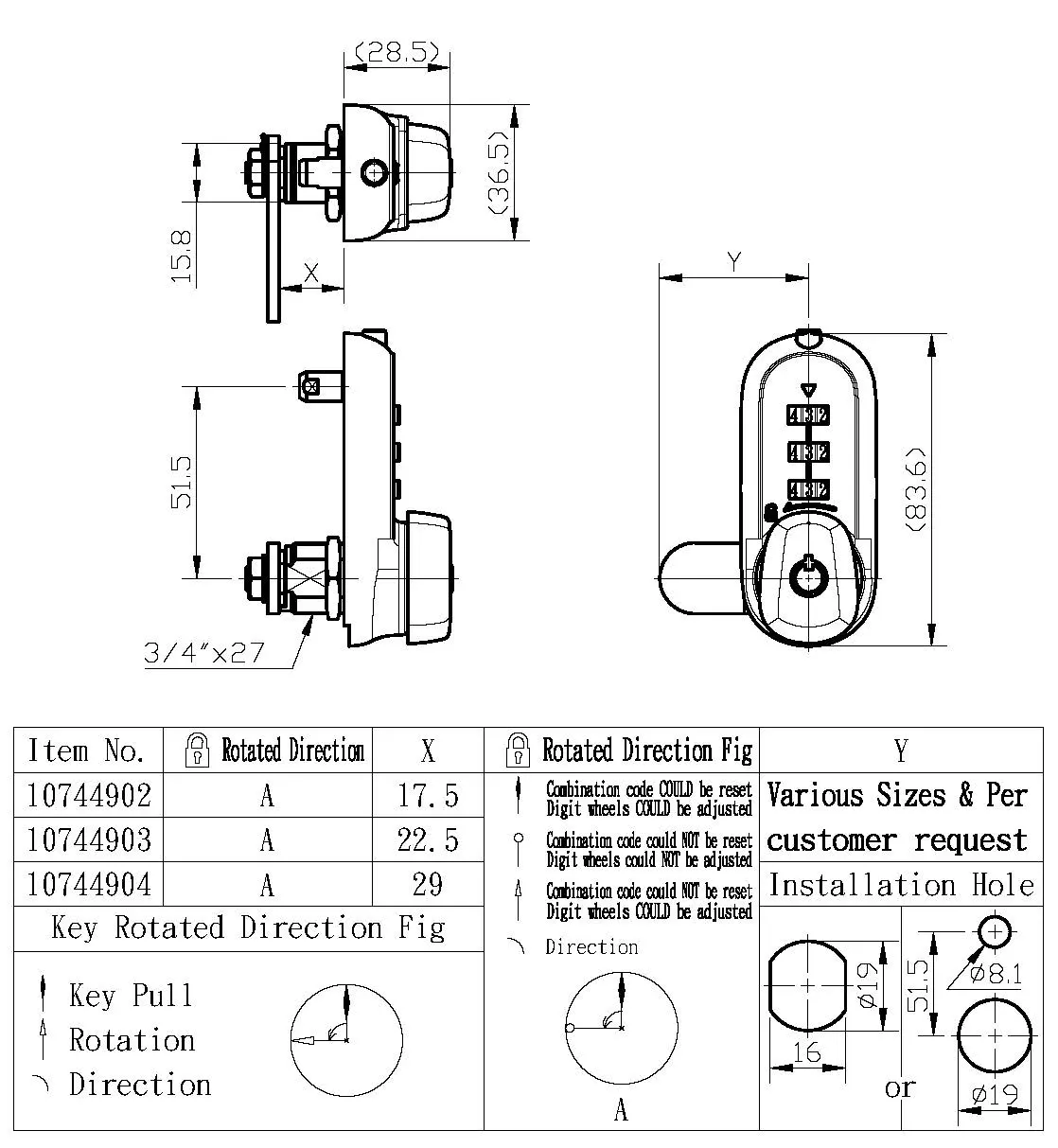 Cerradura de combinación para casillero - Cerradura de leva de 3 dígitos