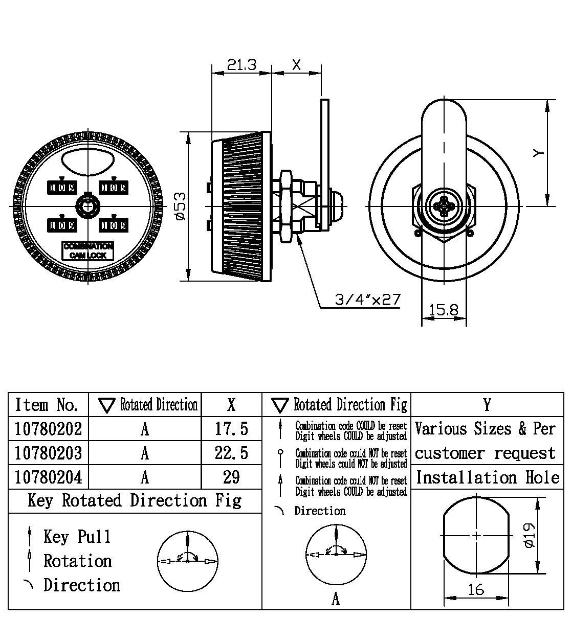 Cerradura de combinación con llave - Cerradura de leva de 4 dígitos