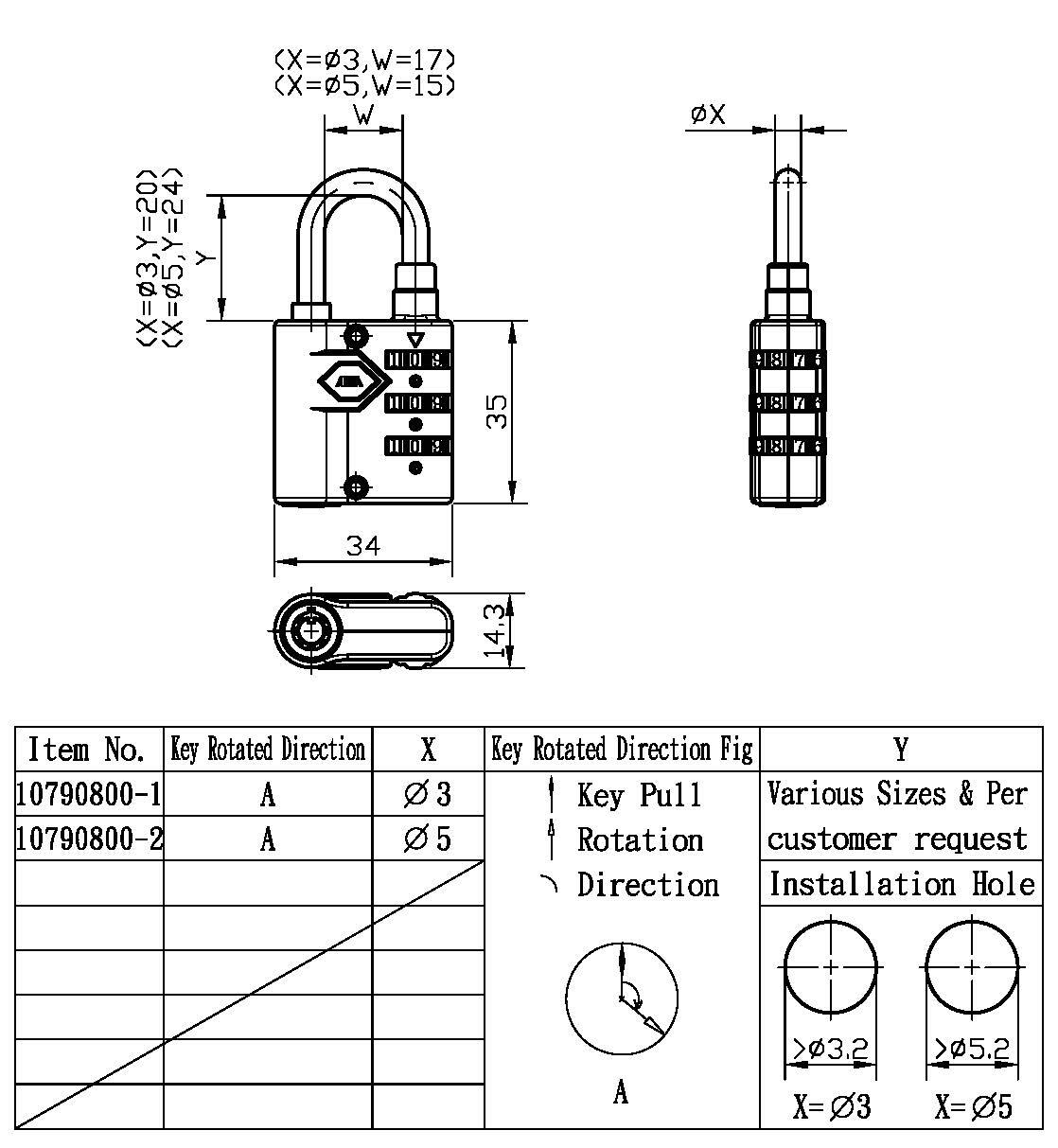 3. Carcasa exterior y cilindro de aleación de zinc. Dos tamaños de grillete (diámetro de 3 mm y 5 mm) a elección del cliente.